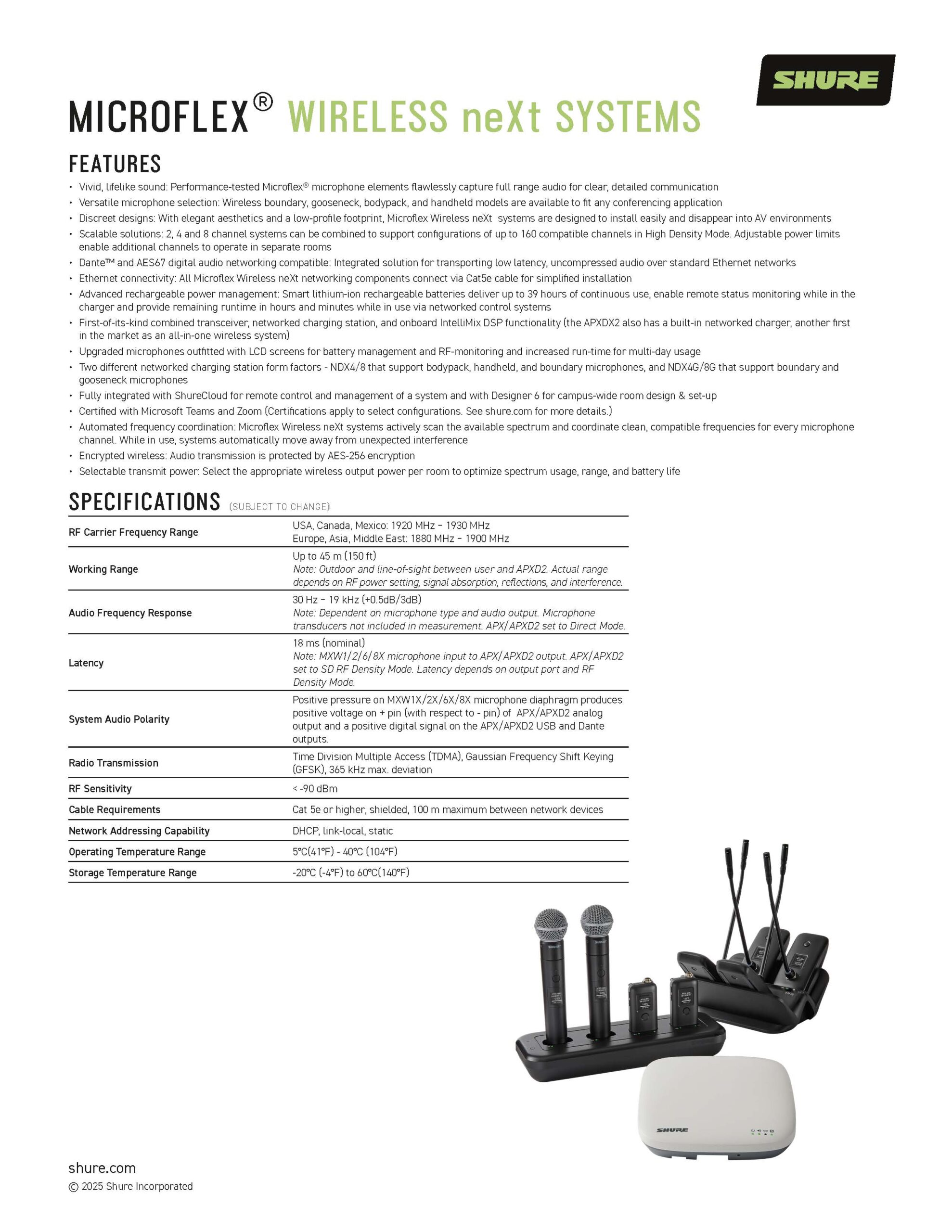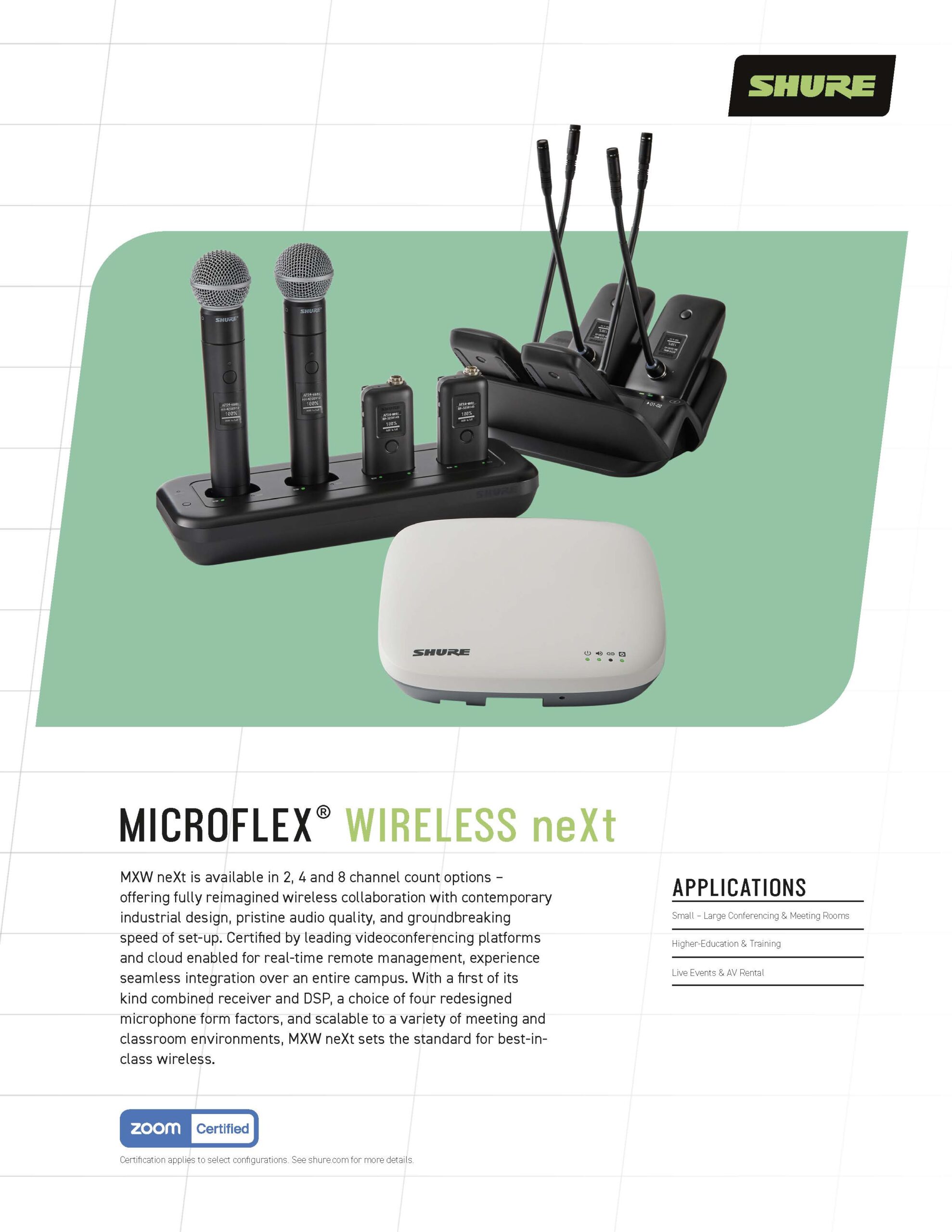 SHURE Microflex® Wireless neXt 無線系統專為創新會議空間精心打造,無論會議室配置多麼複雜或與會人數多寡,皆能提供彈性且優雅的協作解決方案。